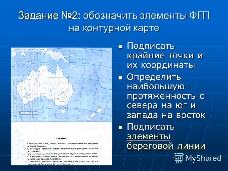 Задание 2: обозначить элементы ФГП на контурной карте Подписать крайние точки и их координаты Подписать крайние точки и их координаты Определить наибольшую протяженность с севера на юг и запада на восток Определить наибольшую протяженность с севера на юг и запада на восток Подписать элементы береговой линии Подписать элементы береговой линии элементы береговой линии элементы береговой линии