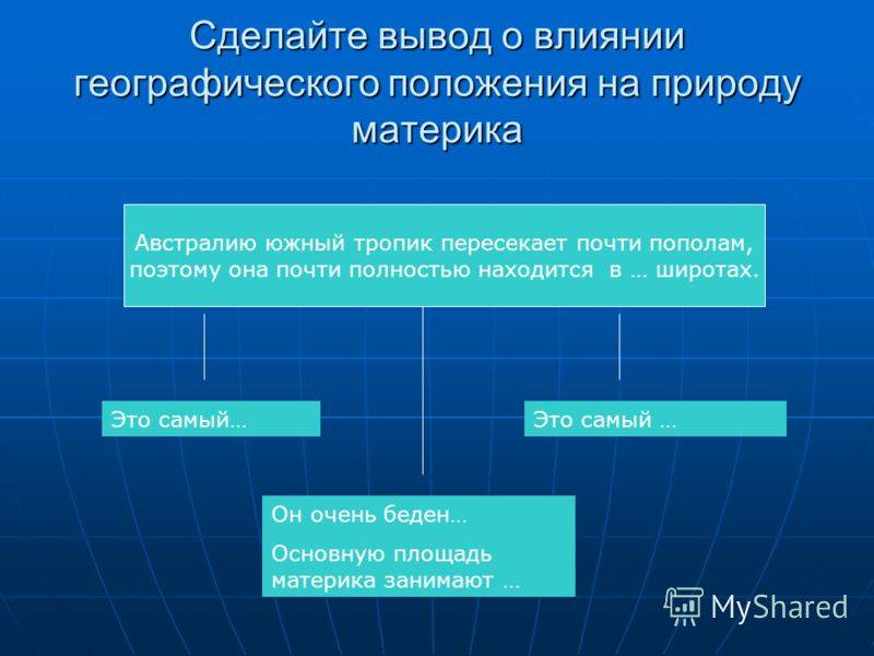 Сделайте вывод о влиянии географического положения на природу материка Австралию южный тропик пересекает почти пополам, поэтому она почти полностью находится в … широтах. Это самый… Он очень беден… Основную площадь материка занимают …