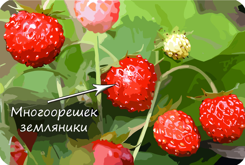 Земляничина (фрага) — плод типа многоорешка, с особенностями: у земляники орешки расположены в мякоти сочного разросшегося цветоложа.