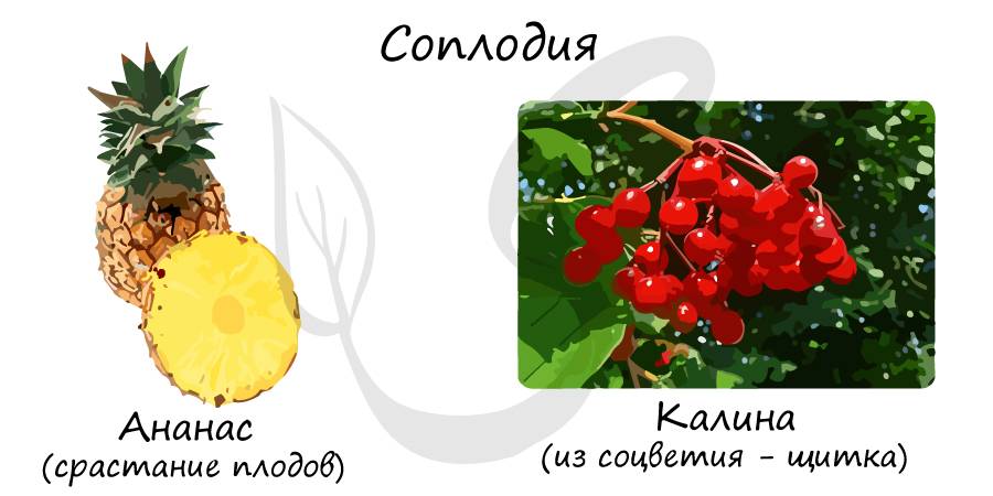 Соплодием называют любую совокупность близкорасположенных или сросшихся плодов, развивающуюся из соцветия (нескольких цветков). Вы должны проводить четкую границу между соплодием и сборным плодом, который возникает из одного цветка. Примерами соплодия являются ананас (срастание плодов), у калины соплодие образуется из щитка (близкое расположение плодов).