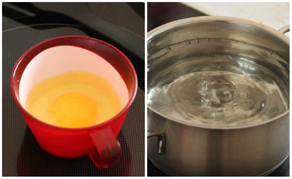 - В меньшую кастрюлю вылить яичный желток, посолить, добавить вино. В большую кастрюлю налить воду и довести до кипения, убавить огонь.