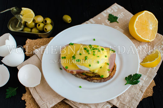 Затем на каждый кусок хлеба кладем кусочек ветчины или бекона. Далее идут яйца пашот. Они сверху должны быть политы теплым голландским соусом (голландез).
