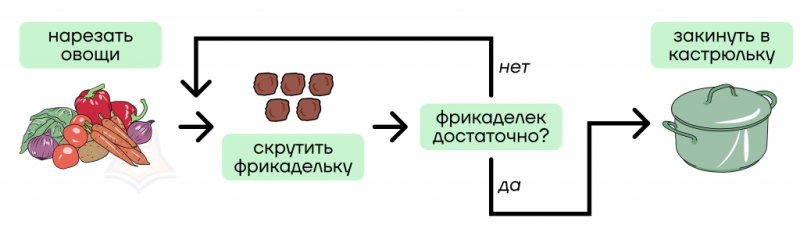 Теперь у нас появился вариант поперчить суп, но эта команда выполнится, только если на условие будет утвердительный ответ. Если условие не выполнится — мы не придем к этой команде, пропустим ее и пойдем дальше по алгоритму.