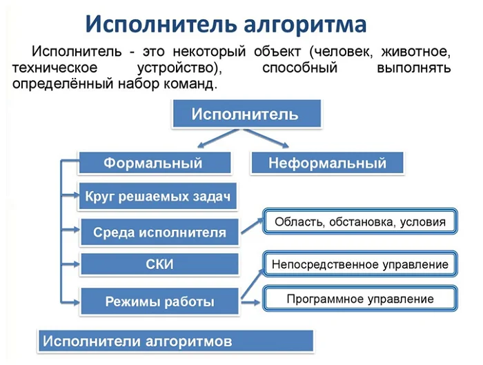 Одной из основных классификаций является деление исполнителей по отношению к тому, как они выполняют. Одушевленных называют неформальными, потому что они понимают, что делают, могут анализировать и даже видоизменять команды при изменении условий. Неодушевленных – формальными исполнителями, так как они строго выполняют команды, механически, не понимая, что делают, не задумываясь над задачей или промежуточными итогами.