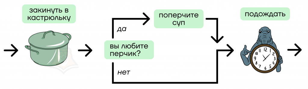 Теперь у нас появился вариант поперчить суп, но эта команда выполнится, только если на условие будет утвердительный ответ. Если условие не выполнится — мы не придем к этой команде, пропустим ее и пойдем дальше по алгоритму.