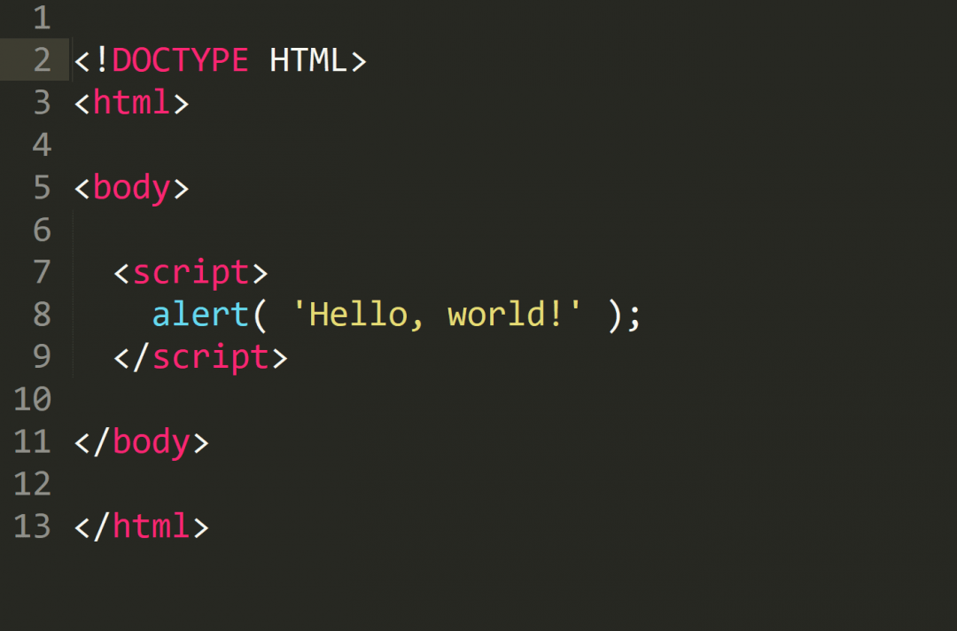 Пример скриптового языка, который вы уже знаете, — JavaScript. На скриншоте ниже он вписан внутрь веб-страницы. Сам код из одной строки прописан между тегами <script> и </script>: браузер будет рисовать страницу, в какой-то момент увидит этот скрипт, выполнит его и пойдёт дальше рисовать страницу.