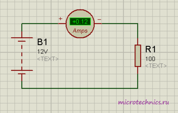 I = \frac{U}{R} = \frac{12}{100} = 0.12Получили величину, равную 0.12 А, что в точности совпадает с практическим результатом, который демонстрирует амперметр в цепи