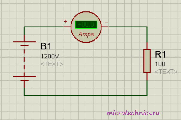 Как видите, здесь источник питания подключен напрямую к резистору, символизирующему полезную нагрузку. Кроме того, в цепи присутствует амперметр, включенный последовательно с резистором. По закону Ома сила тока в данной цепи: