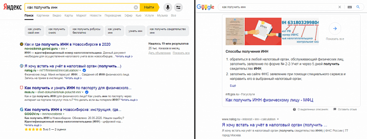 Результаты поиска «Яндекса» и Google отображаются примерно одинаково: у каждой ссылки в выдаче по умолчанию выводится заголовок (тайтл), описание и ссылка. Все вместе называется сниппет. При этом в «Яндексе» есть возможность установить значок сайта слева от заголовка. В Google такая возможность появилась лишь недавно – пока значки отображаются лишь в мобильной выдаче. Также Google поменял расположение ссылки на страницу: теперь она над заголовком, а не под ним.