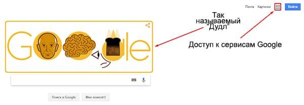 Минималистичный дизайн Google, основой которого является «поисковая строка» и «Дудл», а все дополнительные сервисы доступны по кнопке в правом верхнем углу;