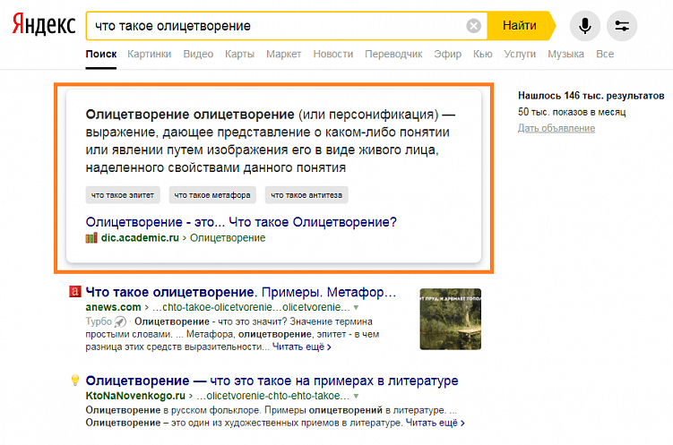 Также в самом верху выдачи иногда можно увидеть расширенный сниппет. Это специальные блоки в верхней части страницы поиска, которые дают более подробную информацию по запросу. То есть пользователь может получить ответ на вопрос без дополнительных кликов.