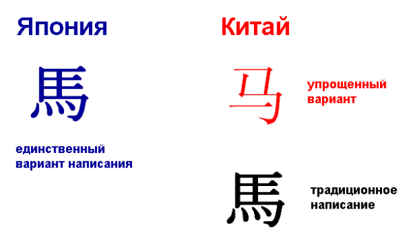 Иероглифы китайского и японского языка также отличаются между собой. Существует упрощенный и сложный стиль написания иероглифов. Сложный стиль использовали в древности, но постепенно сами китайцы упростили написание иероглифов, и появился упрощенный стиль. В сложном иероглифе больше черт, например иероглиф «только» в простом и сложном написании才 – упрощенный стиль (3 черты) , 纔- сложный (23 черты). На территории материкового Китая используется упрощенный стиль (Гонконг и Тайвань – острова — до сих пор используют сложный).