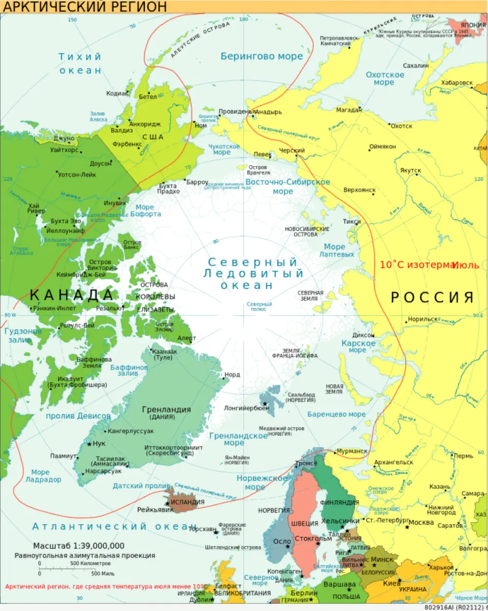 Вот тут на карте арктический регион очерчен красной линией, а в самом центре его ледяной и нежилой северный полюс.