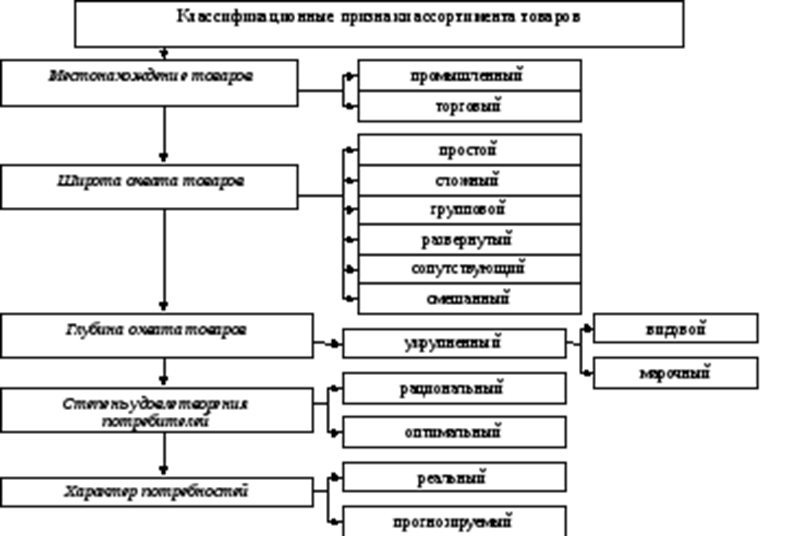 Товарный ассортимент подлежит разделению на группы по признаку местонахождения, на подгруппы – по глубине и широте охвата, на виды в зависимости от степени удовлетворения потребностей, на разновидности в зависимости от характера потребностей.