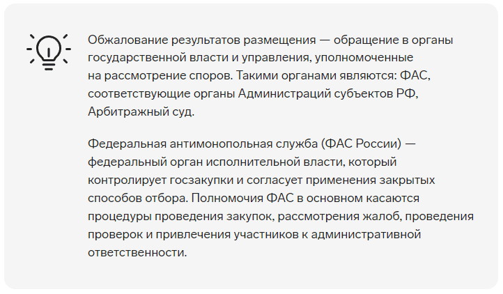 Если заявку отклонили безосновательно, нужно подать жалобу в ФАС. Жалобу подают в специальной форме в ЕИС: «Личный кабинет» → «Жалобы» → «Подать жалобу». Большинство полей формы заполняется автоматически.