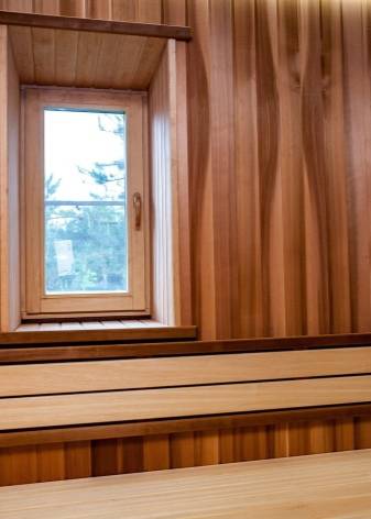 Архитектура. Помещение, может быть как отдельно стоящей, так и встроенное. Внутренняя отделка также как в русской — древесина банных сортов. В отличие от нашей, имеет три помещения: парилка, предбанник и душевая. Сама парилка несколько меньше русской, а вот предбанник больше. Для архитектуры парилки характерно отсутствие окон, зато в обязательном порядке должна быть принудительная вентиляция.