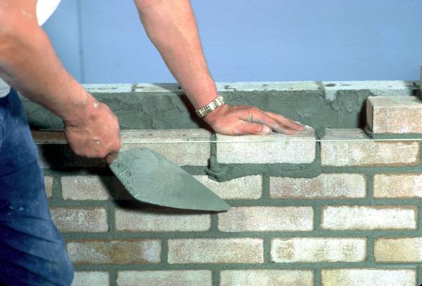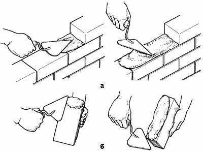 Кладка кирпича на цементный раствор: а) разравнивание раствора; б) намазывание раствора на кирпич.