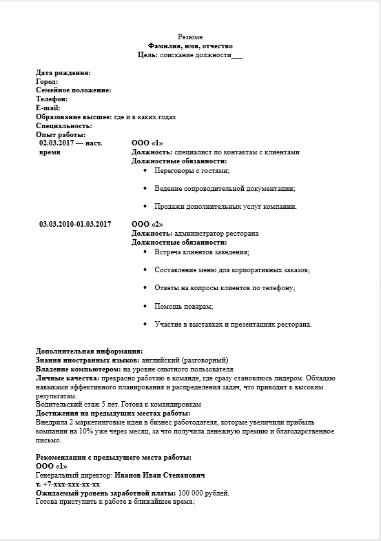 Объем – желательно уместить весь текст на одной странице, потому что, как правило, кандидатов много, а времени на тщательную обработку информации нет. Поэтому дайте возможность потенциальному работодателю оценить ваши качества без приложения лишних усилий.