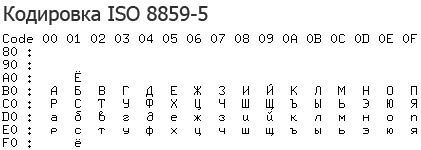 Я не могу не упомянуть о кодировке ISO, Удивительно, но несмотря на то что её никто никогда не использовал, эта кодировка является единственной кодировкой имеющей статус стандарта.