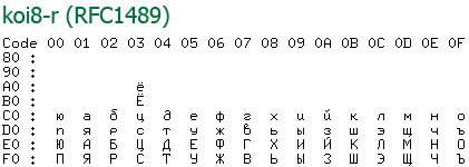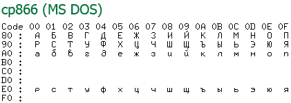 Так выглядела наиболее популярная кодировка под DOS. Примечательно что файлы в этой кодировке до сих пор встречаются. Как правило среди устаревшей архивной информации, в программах WinRar, Блокнот и WordPad, до сих пор есть опции «открыть как текст DOS», впрочем последними двумя мало кто пользуется =).