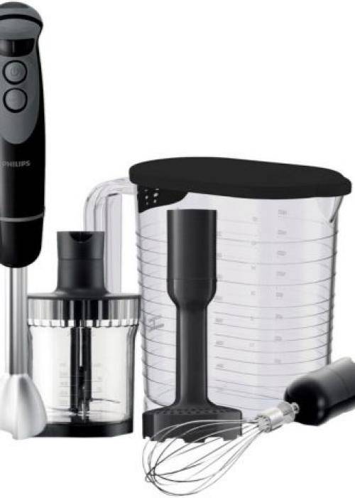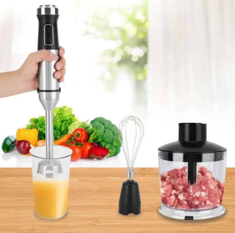 Погружной — состоит из продолговатой рукоятки с кнопками управления. На дне имеются лопастные ножи. Может дополняться специальным сосудом, хотя подходящую посуду не грех выбрать самостоятельно из своих запасов. В комплект некоторых моделей входят различные насадки, в том числе венчик для взбивания как у миксера. Погружной блендер также хорошо справляется с измельчением и смешиванием ингридиентов, таких как сухари или орехи.