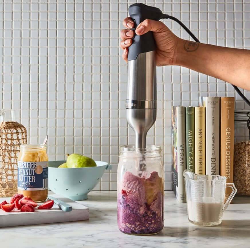 Погружной — состоит из продолговатой рукоятки с кнопками управления. На дне имеются лопастные ножи. Может дополняться специальным сосудом, хотя подходящую посуду не грех выбрать самостоятельно из своих запасов. В комплект некоторых моделей входят различные насадки, в том числе венчик для взбивания как у миксера. Погружной блендер также хорошо справляется с измельчением и смешиванием ингридиентов, таких как сухари или орехи.