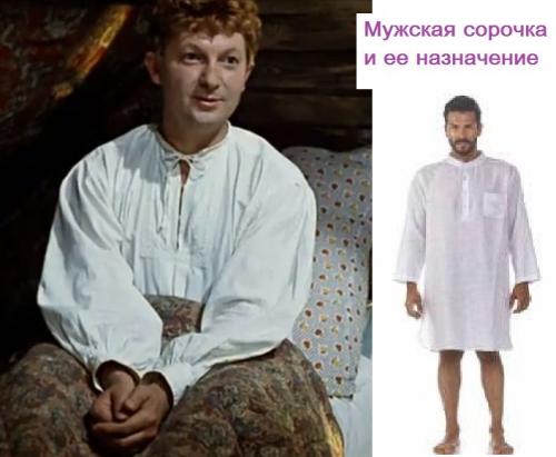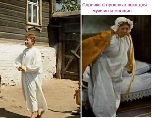 На кадрах из кинофильма «Женитьба Бальзаминова» мы видим сорочки, которые носили в XIX-XX веках. Застежка могла быть не на всю длину, а только сверху от ворота. Мы видим, что мужские и женские ночные сорочки ничем не отличались. Крой сорочек допускал густые сборки по верху рукавов. Мужские сорочки того времени, которые одевались с верхней одеждой, были чуть короче, доходили до колен и заправлялись в брюки.