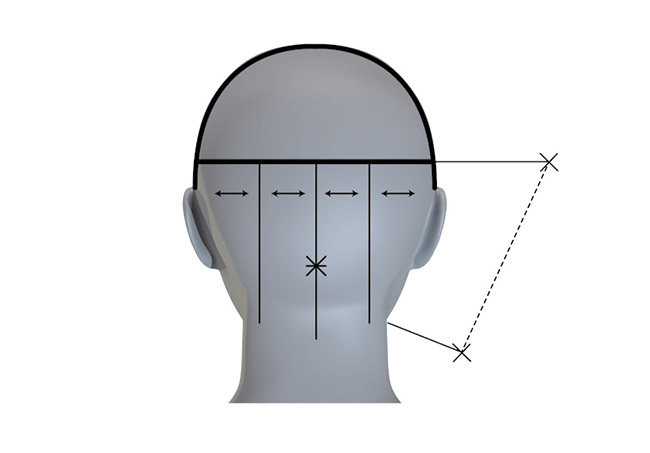 Правильно сделать разделение головы на зоны в соответствии с выбранным типом стрижки боб. В случае классического боба делаем четыре пробора через естественный пробор в форме креста. Далее делаем еще один в задней области по горизонтали, располагая указанную линию на высоте затылочной кости.
