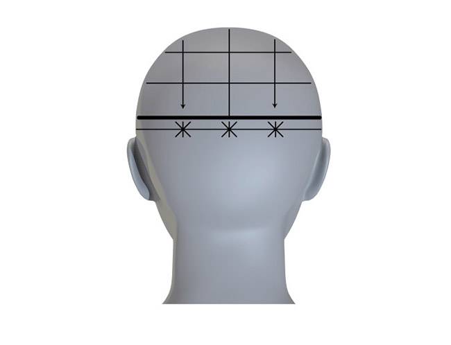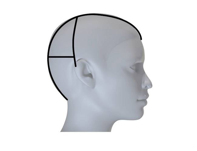 - Происходит деление всех волос на зоны горизонтальным и вертикальным пробором: выделается зона челки (если она есть), 2 зоны висков и 2 зоны затылка.