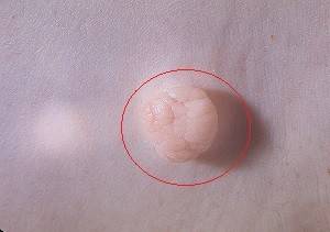 - Форма: в большинстве случаев округлая (встречаются также плоская или неправильная) с неровной поверхностью и четко выраженными границами.
