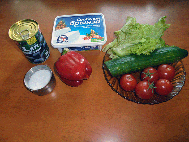 Это самый простой и вкусный рецепт греческого салата. Можно делать его с фетой, но я делала с брынзой, просто потому, что феты не оказалось под рукой. И также для разнообразия добавила порезанные листья салата.
