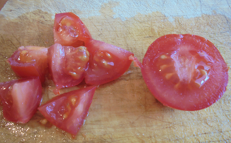 Все продукты крупно нарезать, а яйца просто разрезать на две половинки.
