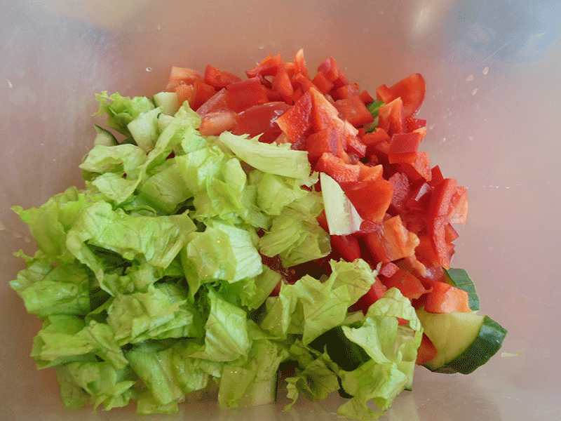 4. Болгарский перец и листья салата порежьте, и тоже выложите в миску.