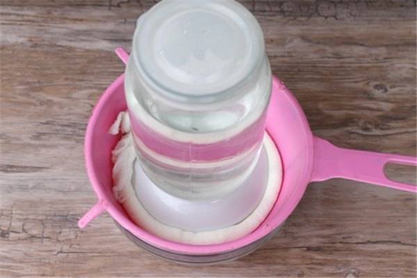 Как только сыворотка стечет — опустите мешочек с творогом обратно в дуршлаг и поместите его в миску, установив сверху гнет. В качестве гнета вы можете снова взять литровую банку, наполненную водой. В таком состоянии ваш сыр проведет еще около 1-2 часов.