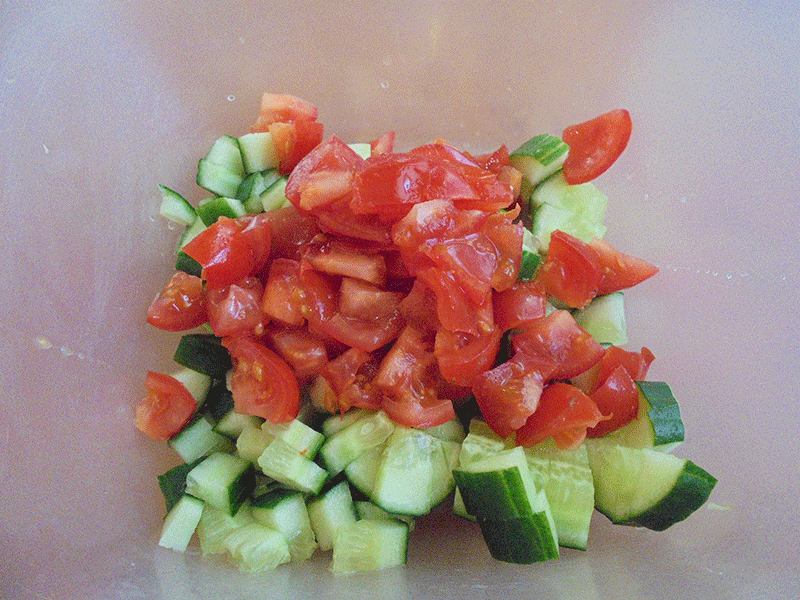 2. Огурец порежьте на крупные кубики, выложите в миску. Порежьте помидор.