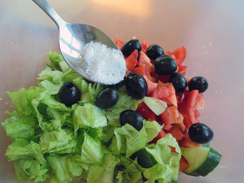 5. Добавьте две столовые ложки оливок, треть чайной ложки соли.
