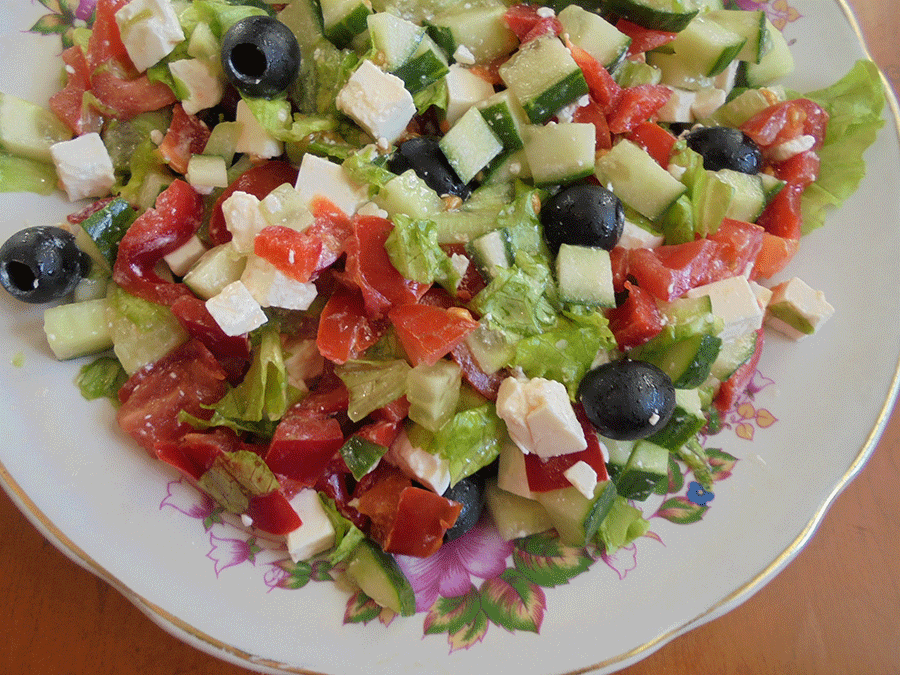 Хориатики салат, как его называют в Греции, означает «деревенский» – ну так и понятно, что в греческой деревне примерно такие продукты постоянно и есть в доме – нарезал все крупными кусками, заправил оливковым маслом… Очень просто, но очень вкусно.