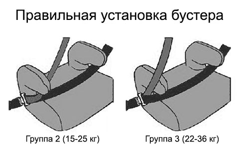 - поясничный ремень проходит под обоими подлокотниками бустера, а плечевой располагается поверх одного из них, если масса тела пассажира достигает 22 кг.
