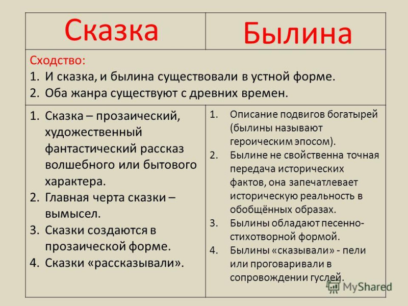 Сходства и различия сказок и былин говорят о том, что это различные фольклорные жанры, но имеющие много общих черт.