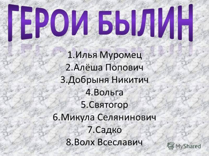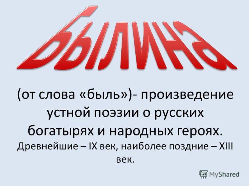 Былина представляет собой народную песнь о приключениях богатырей. В былинах часто присутствует рифмовка. Отличительной чертой былин является яркое описание национального колорита и исторических событий из прошлого. Основа сюжета былины – героические поступки и подвиги богатырей.