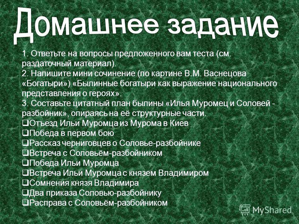 1. Ответьте на вопросы предложенного вам теста (см. раздаточный материал). 2. Напишите мини сочинение (по картине В.М. Васнецова «Богатыри») «Былинные богатыри как выражение национального представления о героях». 3. Составьте цитатный план былины «Илья Муромец и Соловей – разбойник», опираясь на её структурные части. Отъезд Ильи Муромца из Мурома в Киев Победа в первом бою Рассказ черниговцев о Соловье-разбойнике Встреча с Соловьём-разбойником Победа Ильи Муромца Встреча Ильи Муромца с князем Владимиром Сомнения князя Владимира Два приказа Соловью-разбойнику Расправа с Соловьём-разбойником