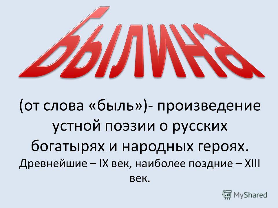 – особый песенный эпический жанр, сложившийся в русском фольклоре на рубеже X-XI веков. Как и в народной сказке, в былине присутствуют этнические элементы бытописания и мифотворчества, однако ее отличительной чертой является не развлекательный или нравоучительный сюжет, на котором основано сказочное повествование, а описание исторически значимых событий, воплотивших народное представление о богатырской силе и доблести.