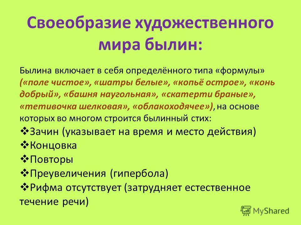 Своеобразие художественного мира былин: Былина включает в себя определённого типа «формулы» («поле чистое», «шатры белые», «копьё острое», «конь добрый», «башня наугольная», «скатерти браные», «тетивочка шелковая», «облакоходячее»), на основе которых во многом строится былинный стих: Зачин (указывает на время и место действия) Концовка Повторы Преувеличения (гипербола) Рифма отсутствует (затрудняет естественное течение речи)