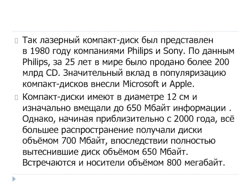 CD. Значительный вклад в популяризацию компакт-дисков внесли Microsoft и Apple. Компакт-диски имеют в диаметре 12 см и изначально вмещали до 650 Мбайт информации . Однако, начиная приблизительно с 2000 года, всё большее распространение получали диски объёмом 700 Мбайт, впоследствии полностью вытеснившие диск объёмом 650 Мбайт. Встречаются и носители объёмом 800 мегабайт.