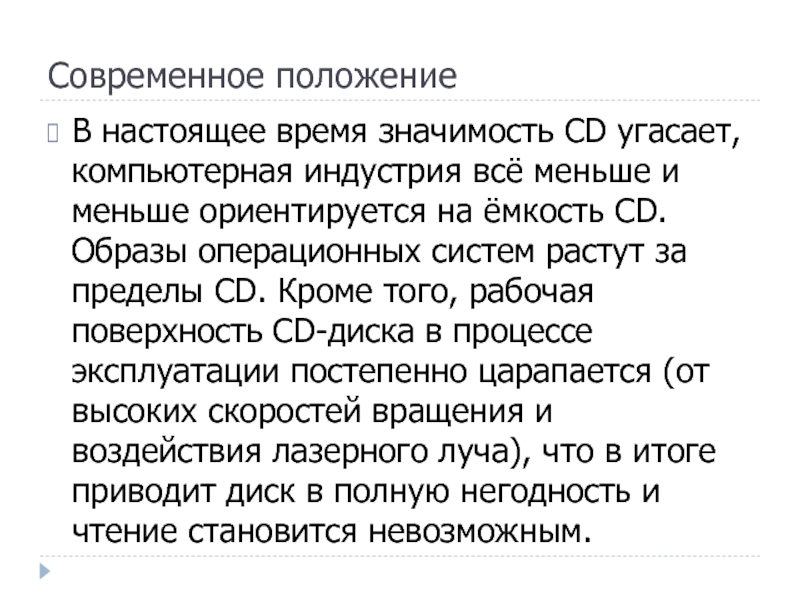 растут за пределы CD. Кроме того, рабочая поверхность CD-диска в процессе эксплуатации постепенно царапается (от высоких скоростей вращения и воздействия лазерного луча), что в итоге приводит диск в полную негодность и чтение становится невозможным.