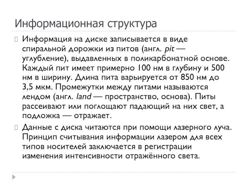 примерно 100 нм в глубину и 500 нм в ширину. Длина пита варьируется от 850 нм до 3,5 мкм. Промежутки между питами называются лендом (англ. land — пространство, основа). Питы рассеивают или поглощают падающий на них свет, а подложка — отражает.Данные с диска читаются при помощи лазерного луча. Принцип считывания информации лазером для всех типов носителей заключается в регистрации изменения интенсивности отражённого света.