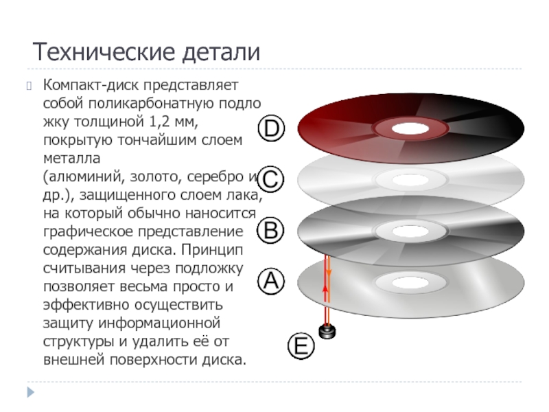 содержания диска. Принцип считывания через подложку позволяет весьма просто и эффективно осуществить защиту информационной структуры и удалить её от внешней поверхности диска.