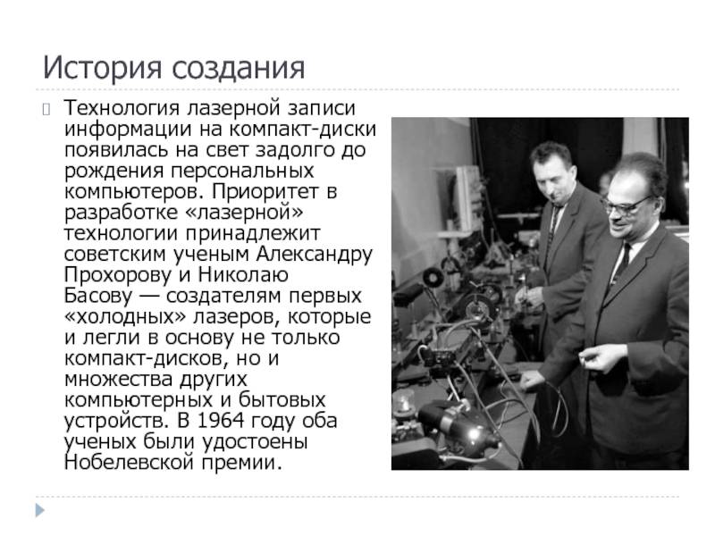 принадлежит советским ученым Александру Прохорову и Николаю Басову — создателям первых «холодных» лазеров, которые и легли в основу не только компакт-дисков, но и множества других компьютерных и бытовых устройств. В 1964 году оба ученых были удостоены Нобелевской премии.