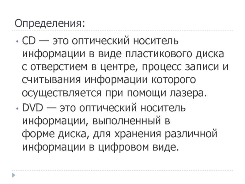 CD (Compact Disk) – оптический диск, предназначенный для хранения цифровой информации, запись и считывание которой осуществляет лазерная установка. Распространены стандартные CD емкостью до 700 Мб.