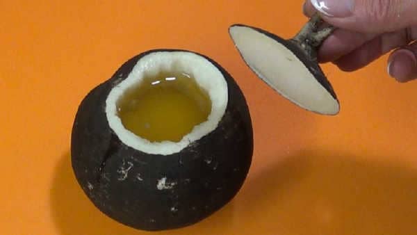 Самый известный и по праву заслуживший хорошие отзывы: срезать с корнеплода «крышечку», проковырять ложкой углубление. Залить туда мед. Закрыть крышечку, дать постоять 5 часов. Полученную смесь желтого цвета принимать от кашля 4-6 раз в день по чайной ложке.